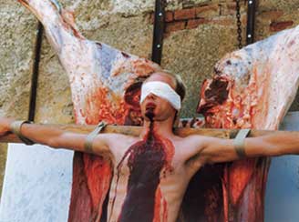 Performance de Hermann Nitsch, el cual suele usar sangre para crear sus obras